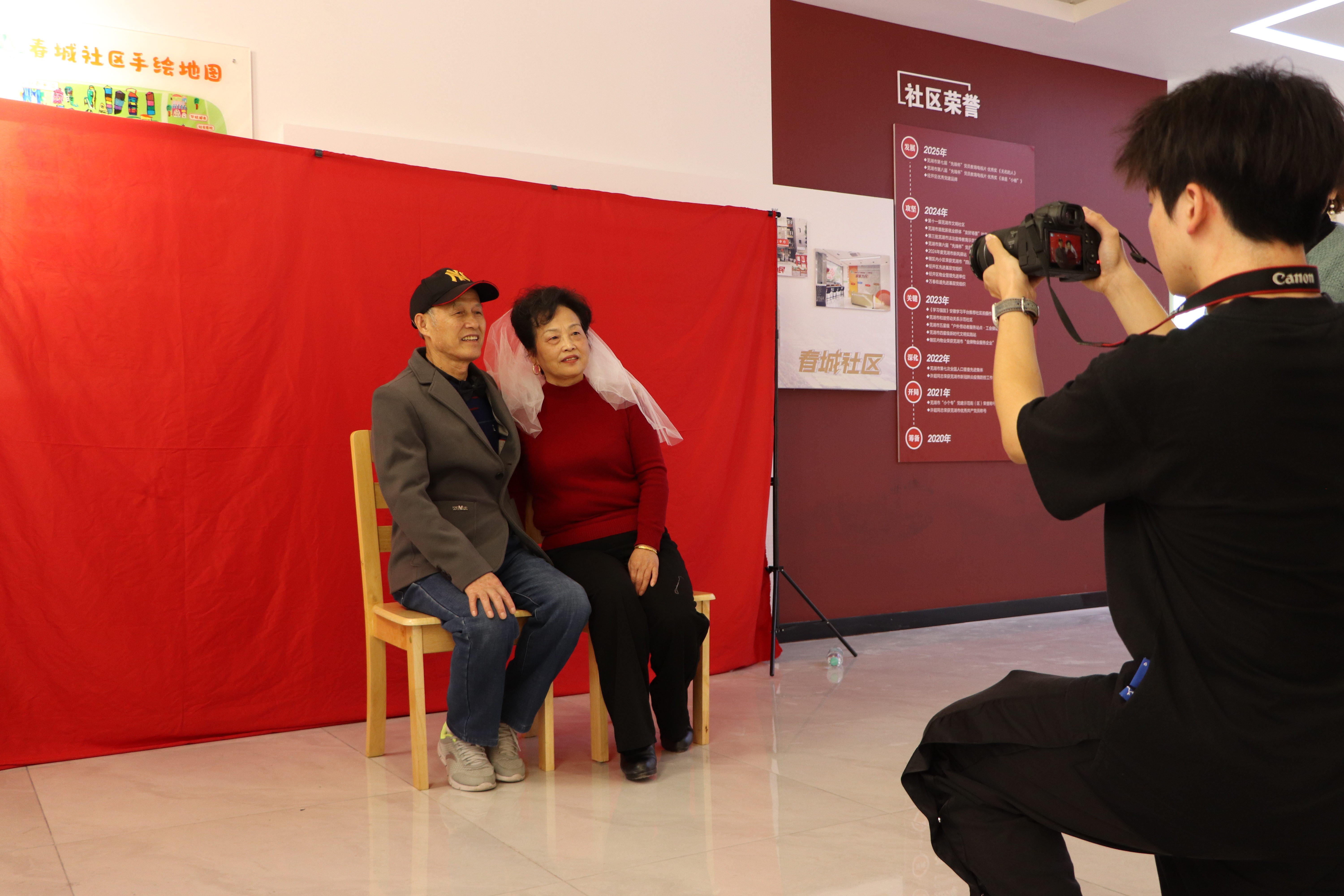 下午三点,活动正式拉开帷幕。社区活动现场被精心划分为登记引导区、拍摄区和等候互动区。支部团员与摄影团队成员分工协作,热情引导前来参与的老人们进行信息登记,现场秩序井然,老人们脸上写满期待。拍摄区内,“定格夕阳红”团队的摄影师们细心调整光线与构图,用专业设备为老人们拍摄纪念照和夫妻合影。志愿者们则化身“形象顾问”与“陪伴天使”,耐心为老人整理衣装、佩戴头纱等配饰,并不时与他们亲切交谈,缓解拍摄时的紧张情绪。不少老人感慨,这是他们第一次如此正式地拍照,尤其是弥补了年轻时未能拍摄婚纱照的遗憾,脸上洋溢着幸福的笑容。